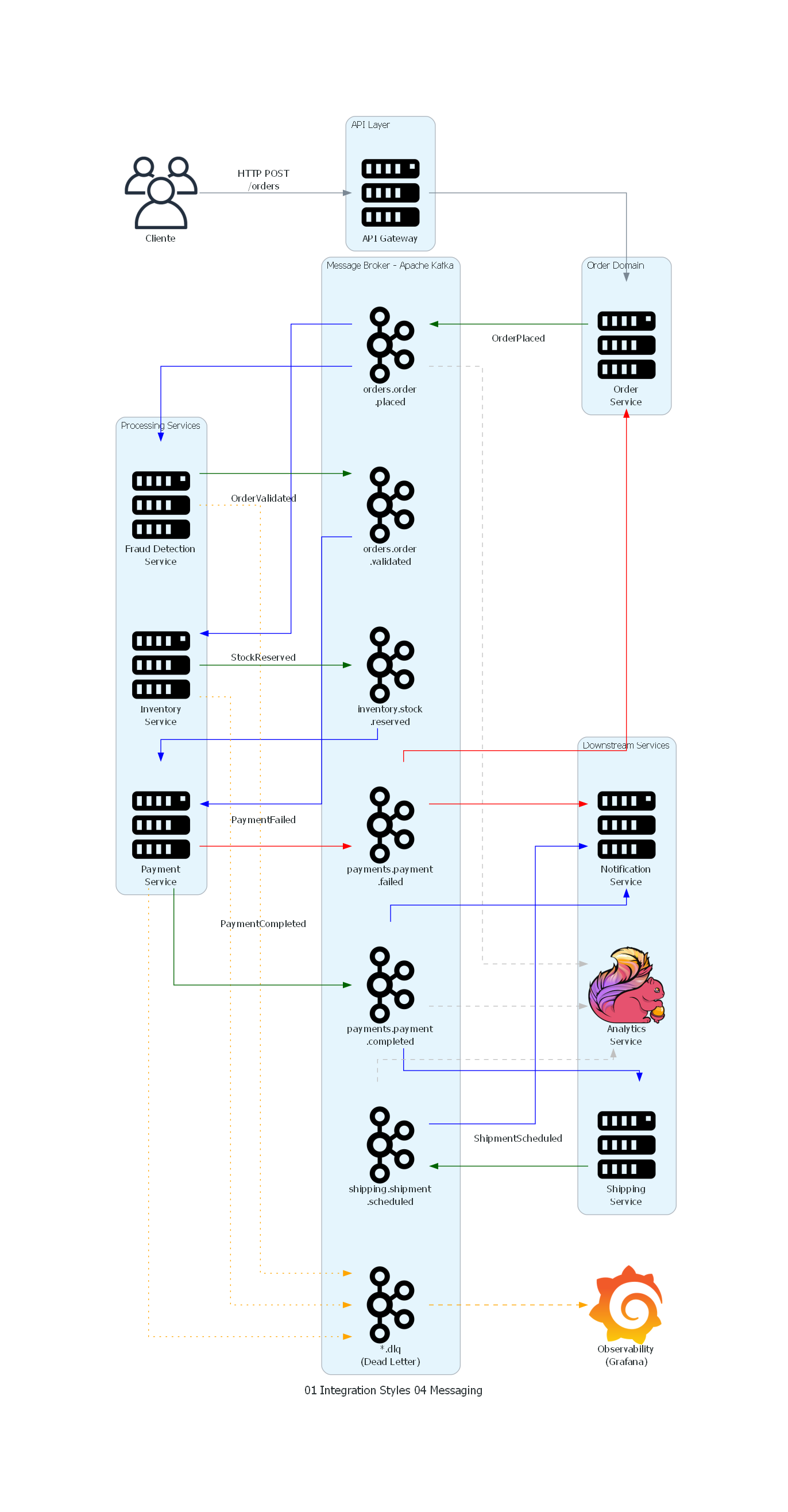 - Observabilidad: en un flujo donde un mensaje pasa por múltiples servicios y transformaciones, ¿cómo se traza el camino end-to-end para diagnosticar problemas?