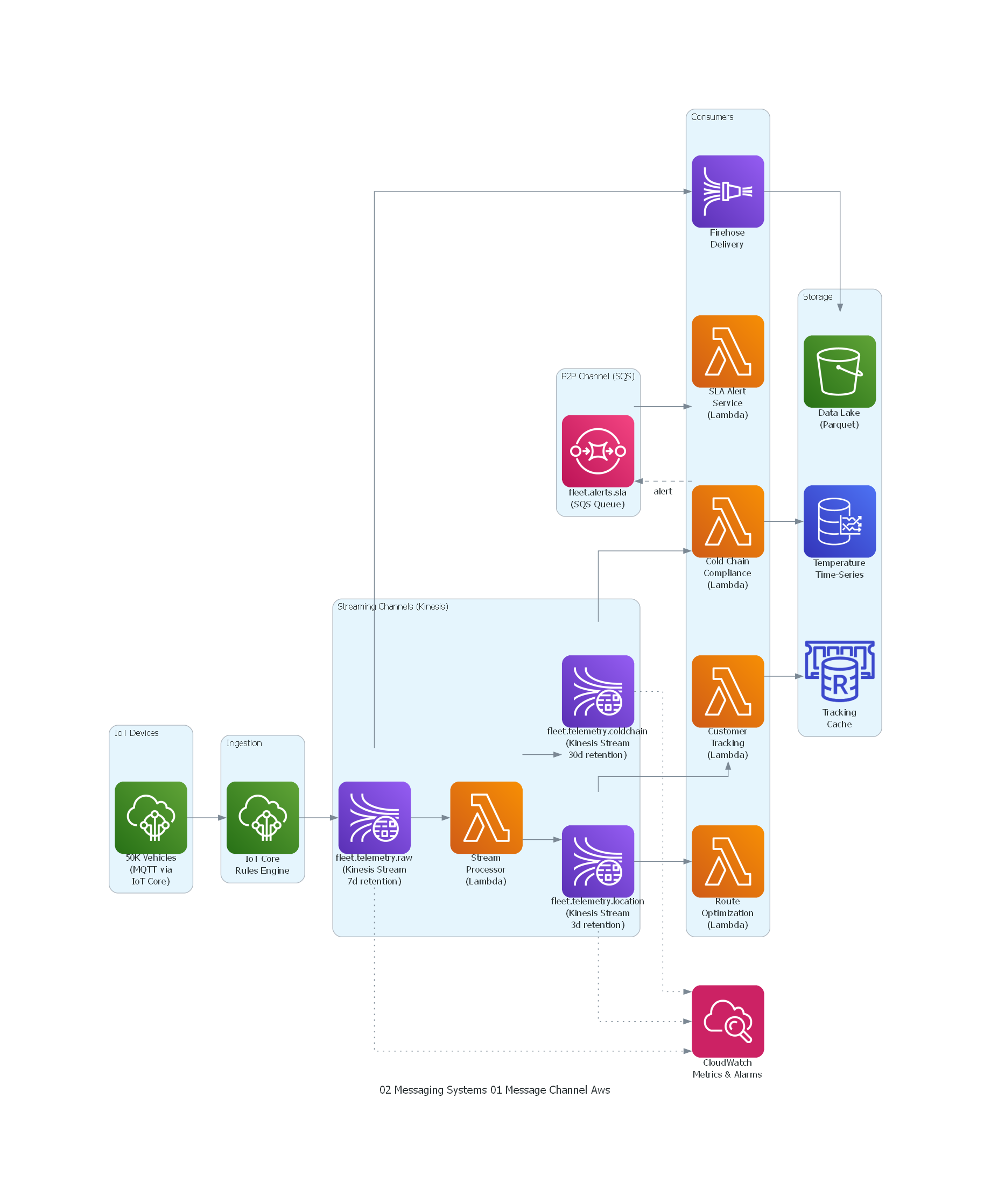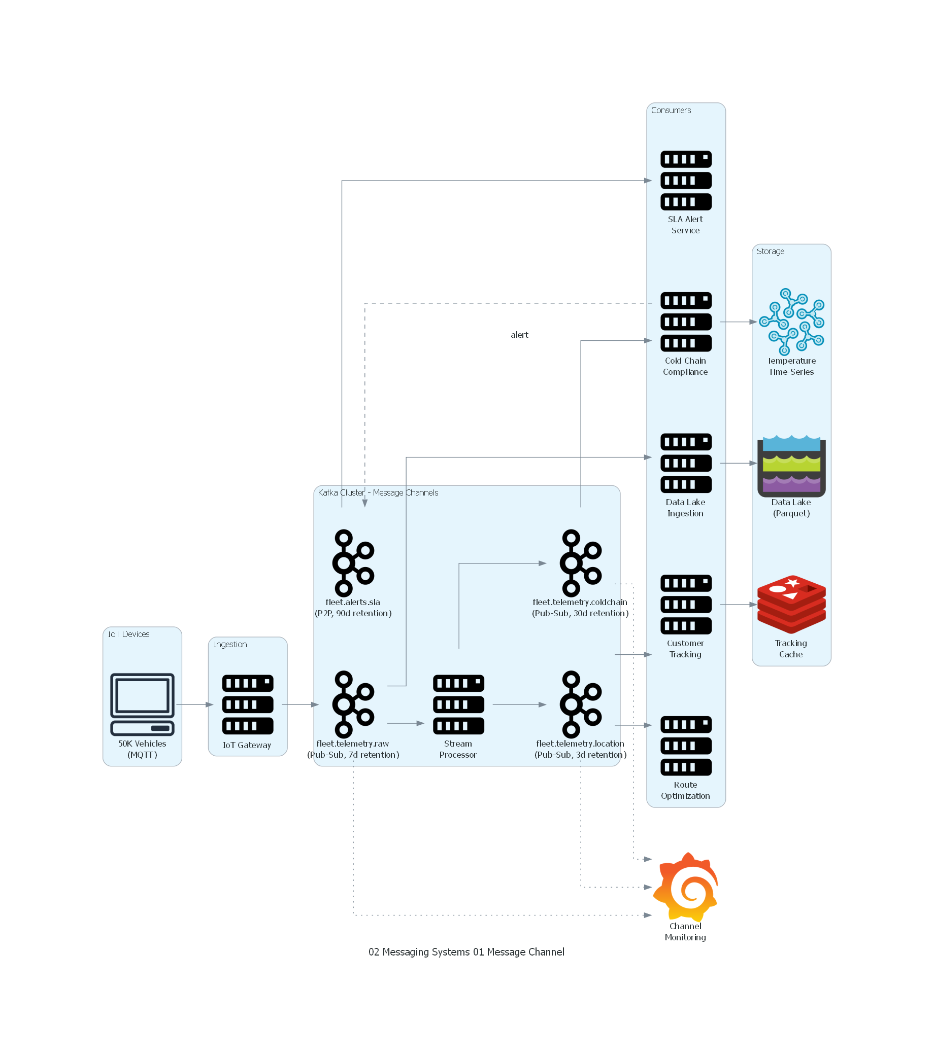 - Métricas por canal: messages-in/sec, messages-out/sec, consumer lag (por consumer group), storage size, oldest unprocessed message age.