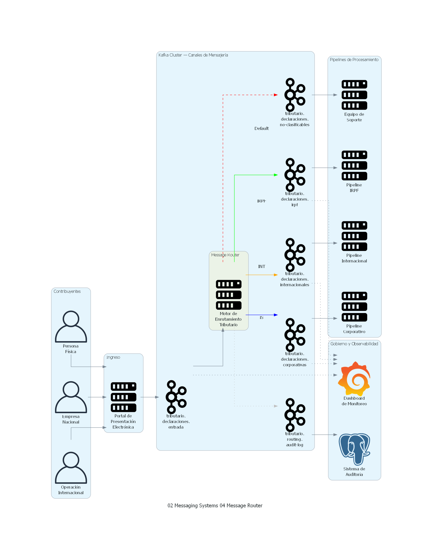 - Encriptación: TLS en tránsito entre router y broker. Si los mensajes contienen datos sensibles (declaraciones de impuestos con datos personales), considerar cifrado a nivel de mensaje además de cifrado en tránsito.