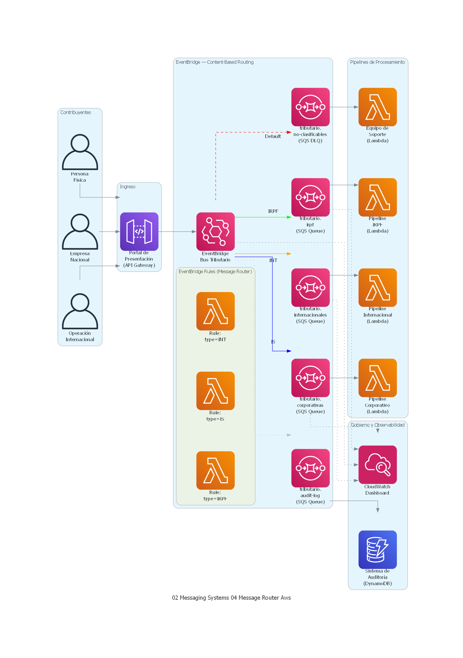 - En AWS, EventBridge Rules son routers nativos que evalúan patrones de eventos y los dirigen a targets específicos.