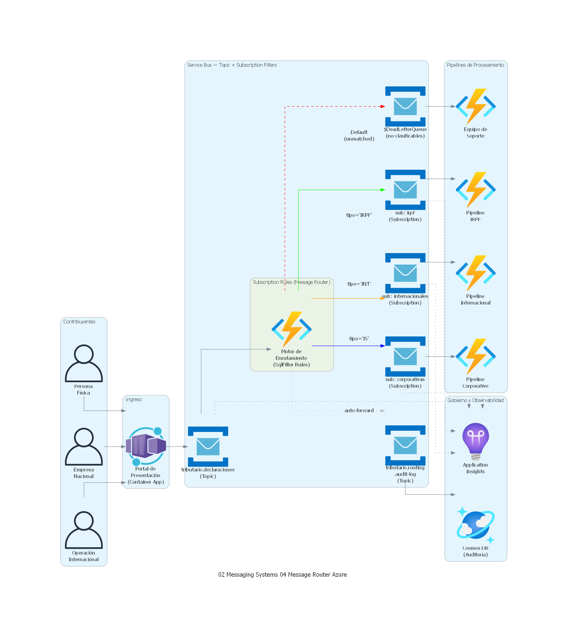 Cuándo aporta valor: cuando un flujo de mensajes debe dividirse en múltiples destinos con criterios diferentes, y la decisión de routing no debe residir en el productor ni dispersarse en los consumidores. Esto ocurre en prácticamente toda arquitectura de integración enterprise con más de dos participantes: sistemas tributarios con diferentes tipos de declaraciones, sistemas bancarios con diferentes tipos de transacciones, plataformas de e-commerce con diferentes flujos por tipo de orden, sistemas de salud con diferentes tipos de mensajes clínicos.