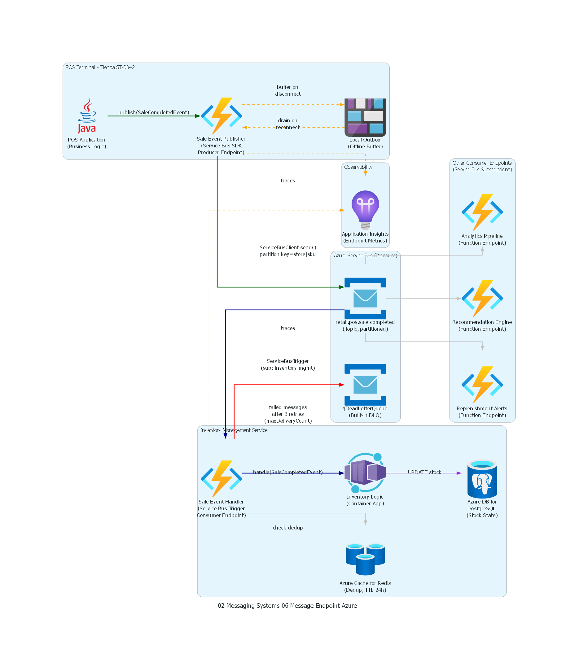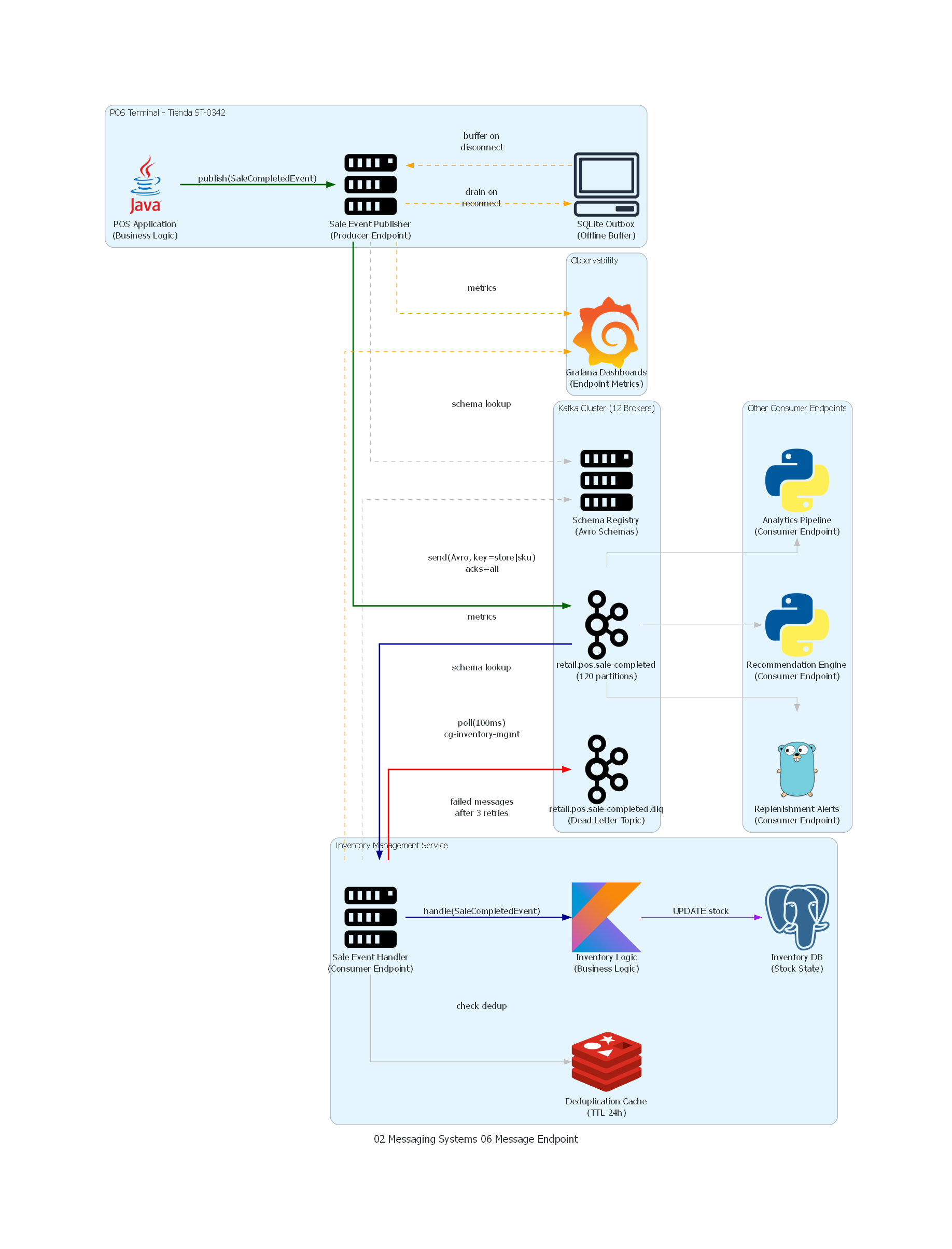 - Retail: un sistema POS (Point of Sale) en tienda necesita reportar cada venta al sistema central de inventario. Sin un endpoint bien encapsulado, el código del POS contiene directamente llamadas a la API de Kafka Producer con configuración de conexión al cluster central. Cuando la empresa migra a Azure Service Bus, hay que reescribir el módulo de ventas completo — no solo la capa de comunicación.