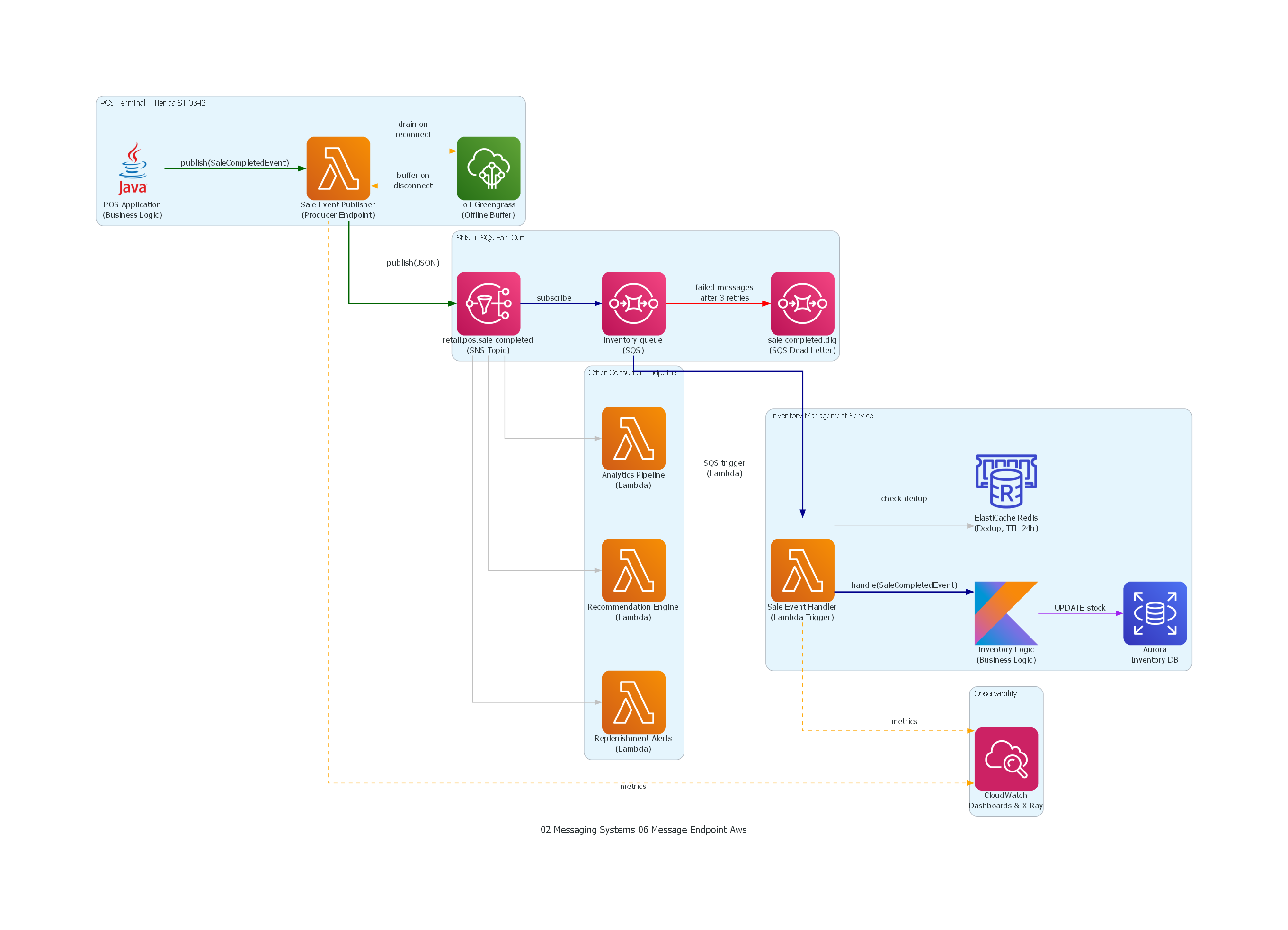 Producer Endpoint: SqsClient.sendMessage() o SnsClient.publish() para producción. EventBridgeClient.putEvents() para eventos de dominio con routing basado en reglas. El SDK gestiona retry con exponential backoff, autenticación IAM y request signing.