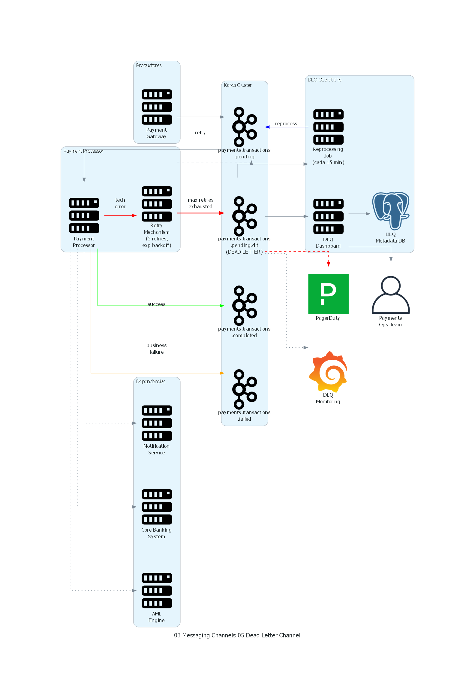 - Retención del DLQ: debe ser suficiente para permitir la resolución del problema (outages prolongados, bugs que requieren deployment de fix). Típicamente 14-30 días.