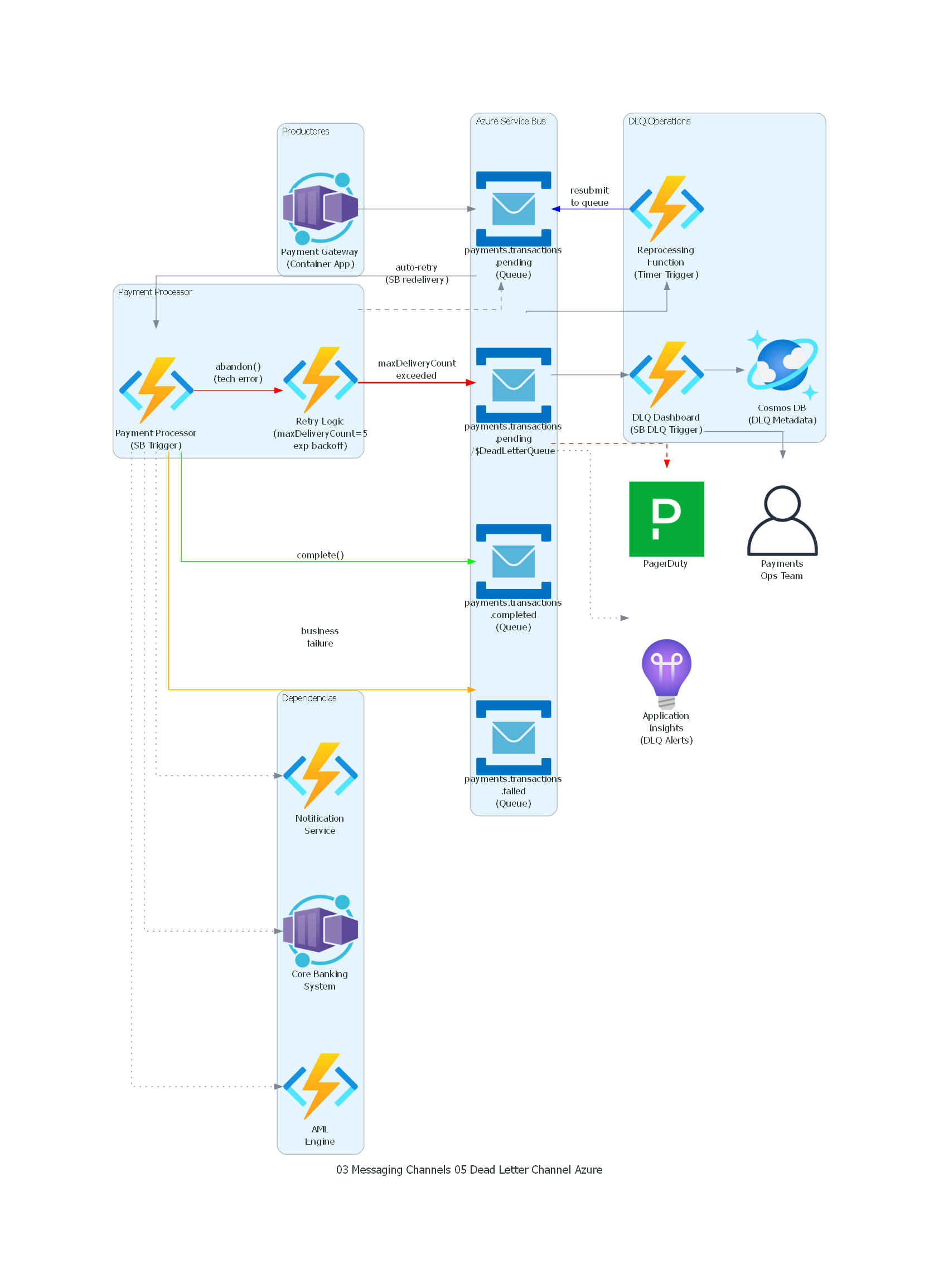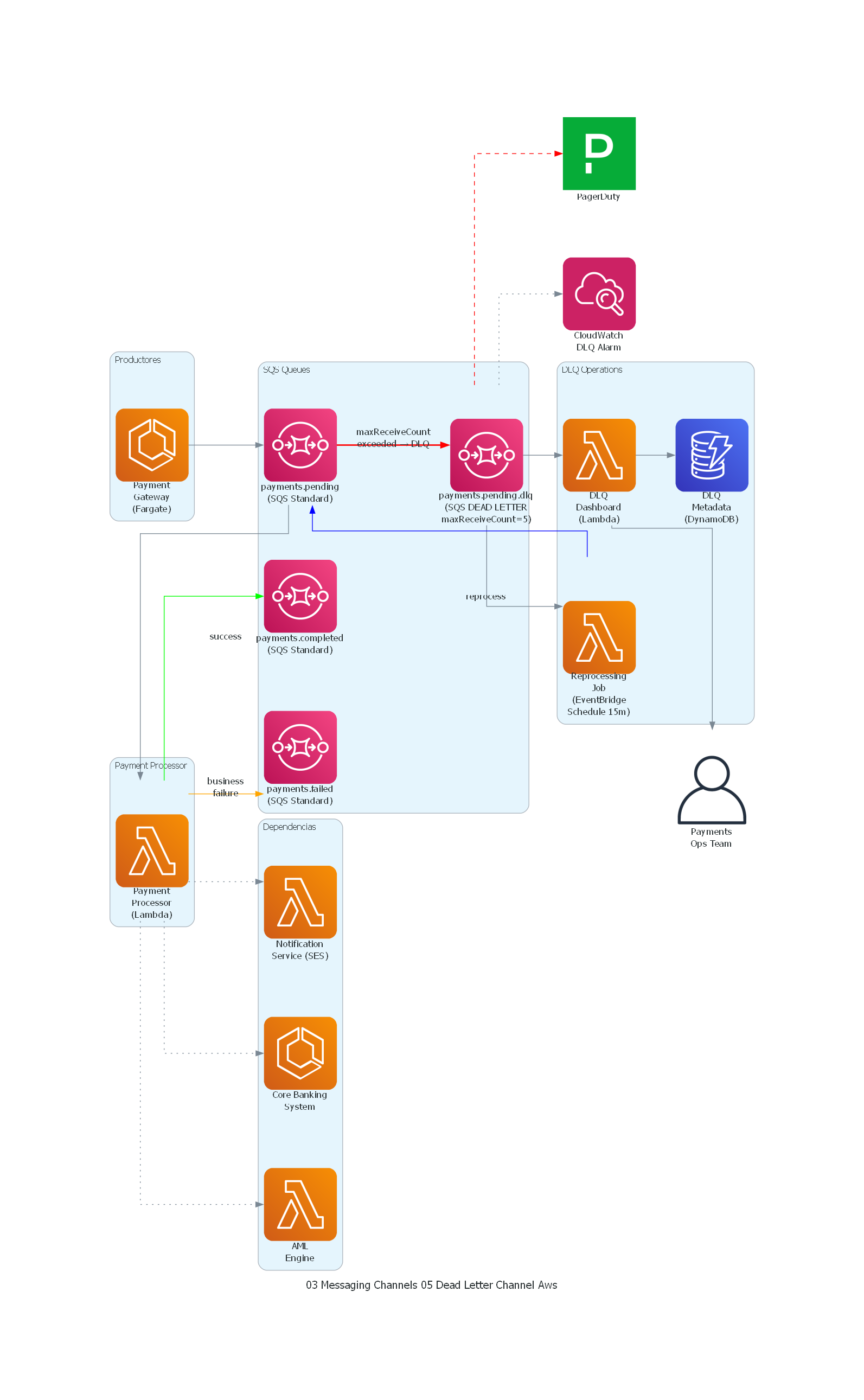 - Financial Services: un sistema de procesamiento de pagos recibe una instrucción de pago que referencia una cuenta que está temporalmente bloqueada por una investigación de fraude. El procesamiento del pago falla porque el servicio de cuentas rechaza operaciones sobre cuentas bloqueadas. Después de 5 reintentos con backoff exponencial, el mensaje se mueve al DLQ. Cuando la investigación de fraude concluye y la cuenta se desbloquea, un operador reprocesa los mensajes del DLQ y los pagos se ejecutan exitosamente.