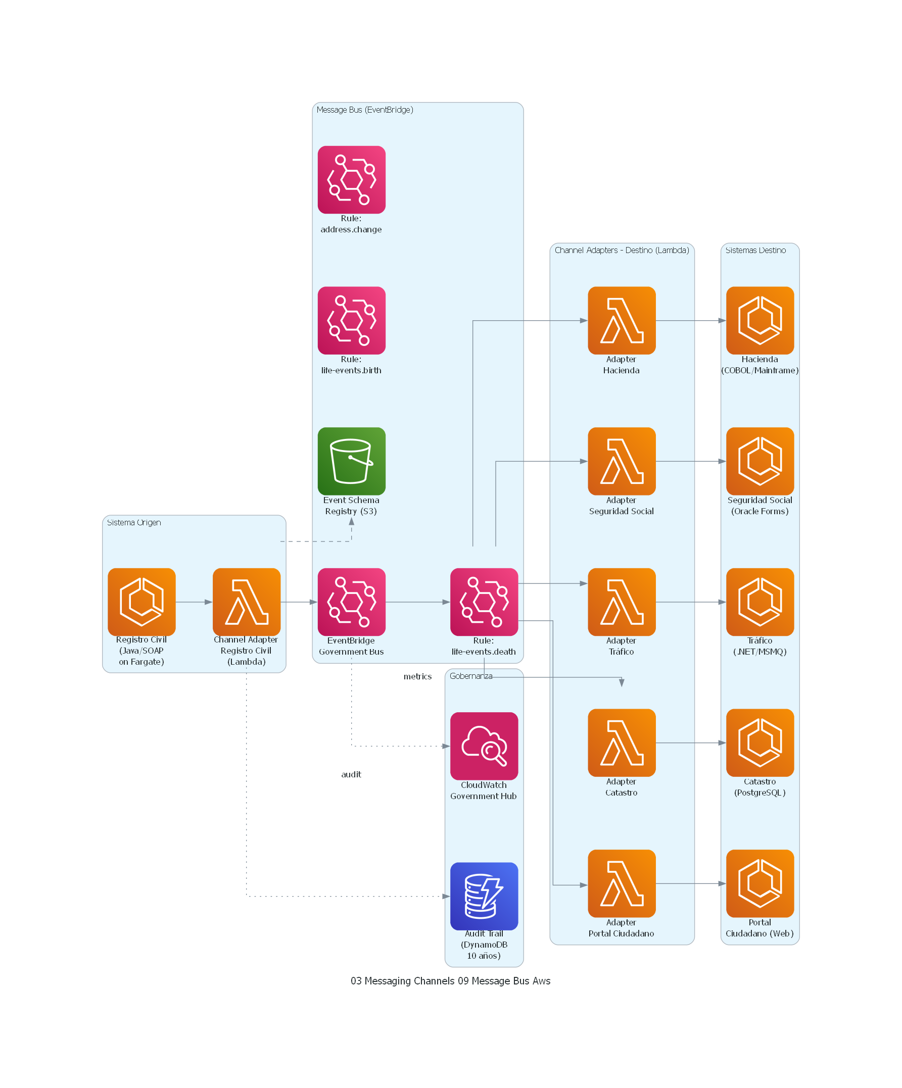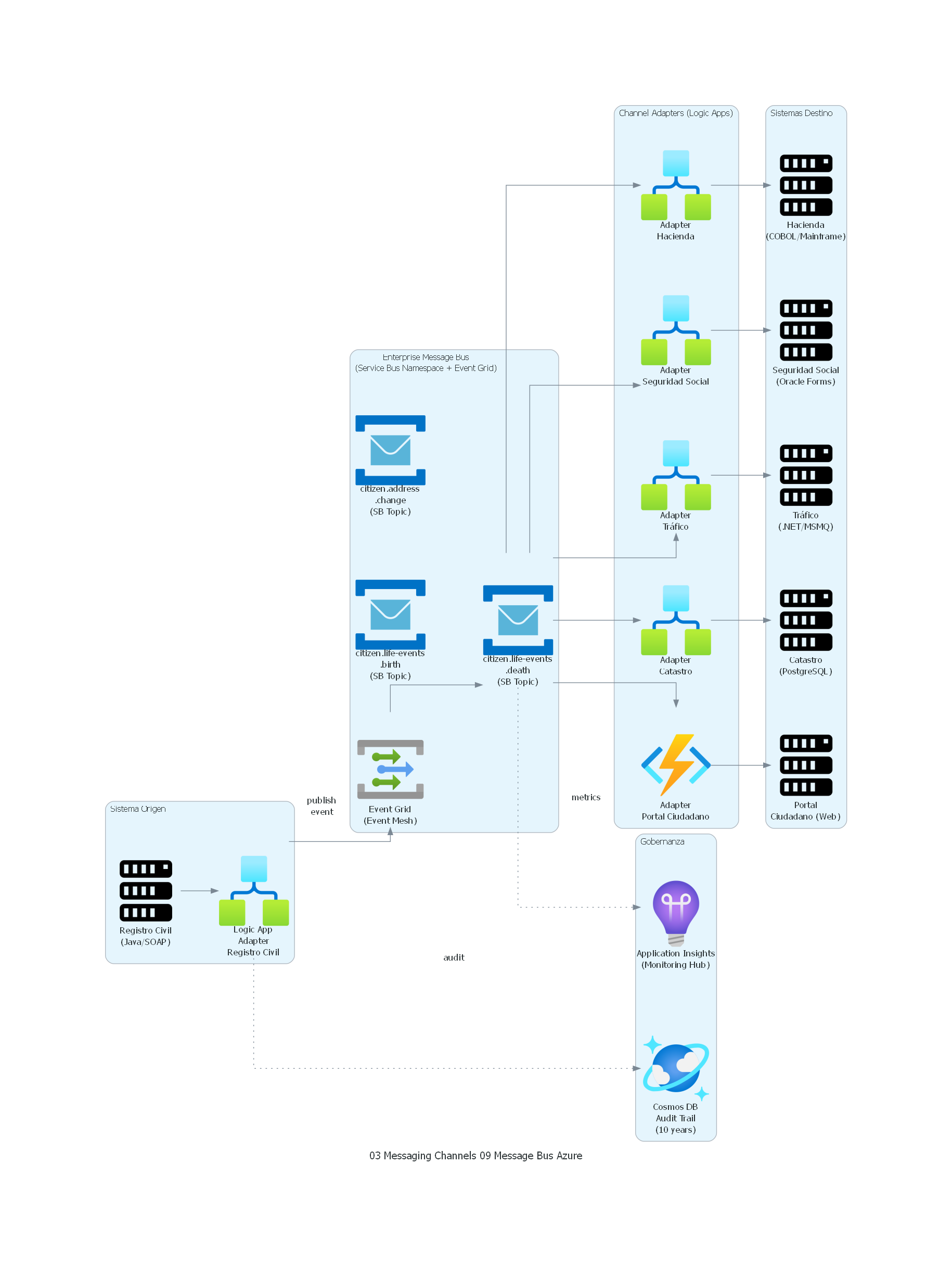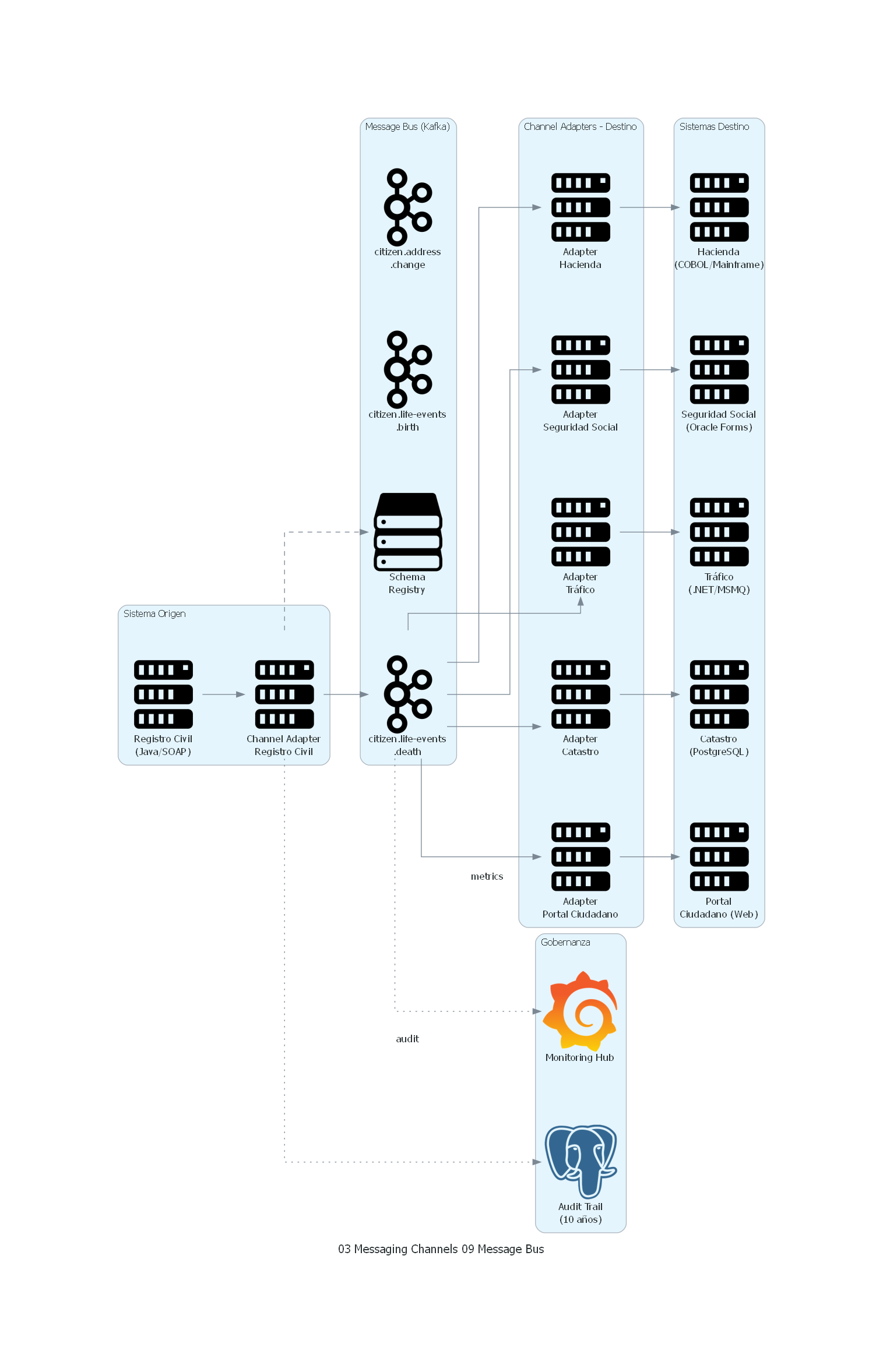 - Canales estandarizados: el bus define un catálogo de canales (topics) organizados por dominio de negocio, no por sistema origen o destino.