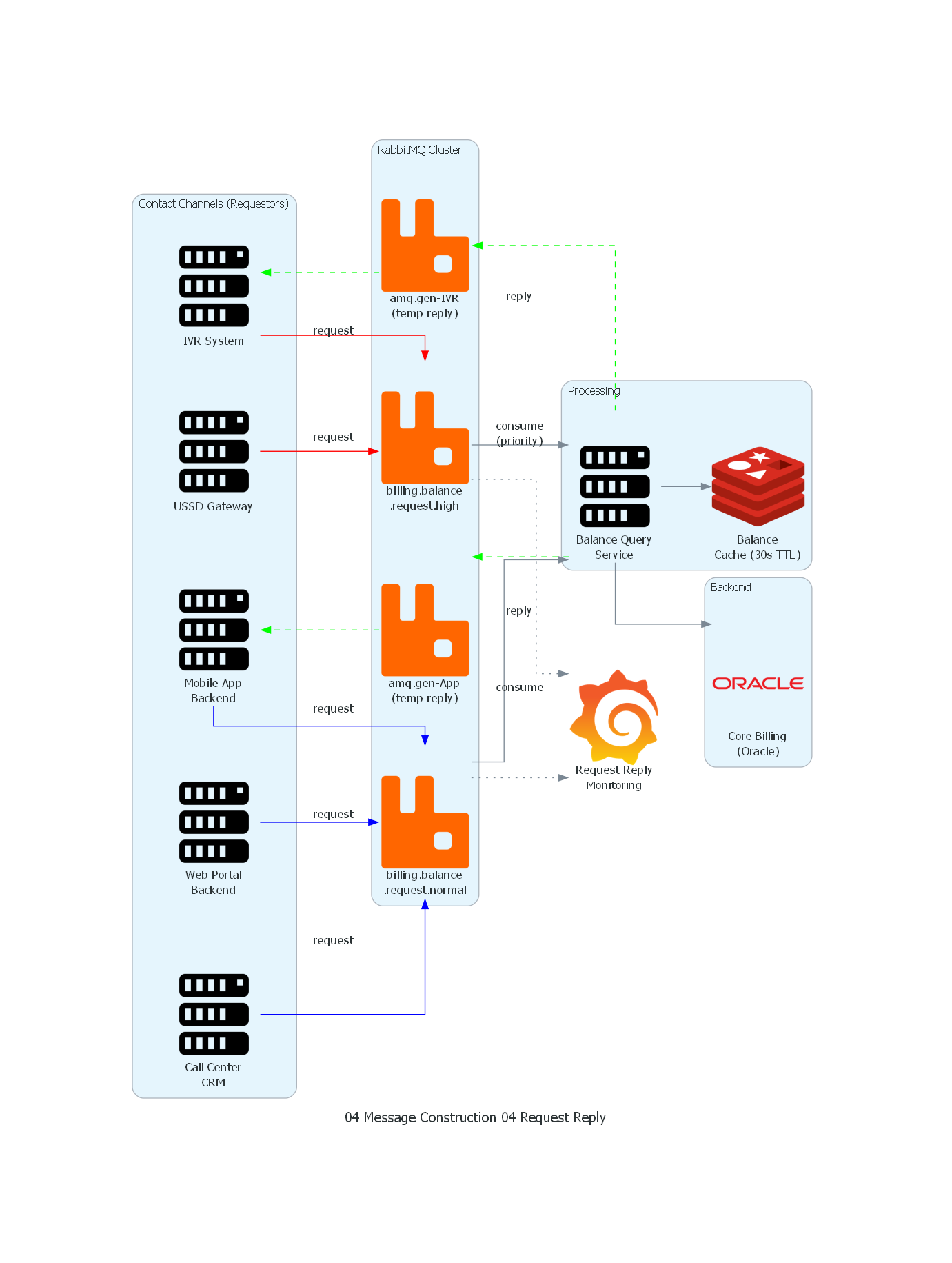 - Distributed tracing: propagar el trace_id de OpenTelemetry en los headers del mensaje para trazar la petición completa a través del request channel, el processing y el reply channel.