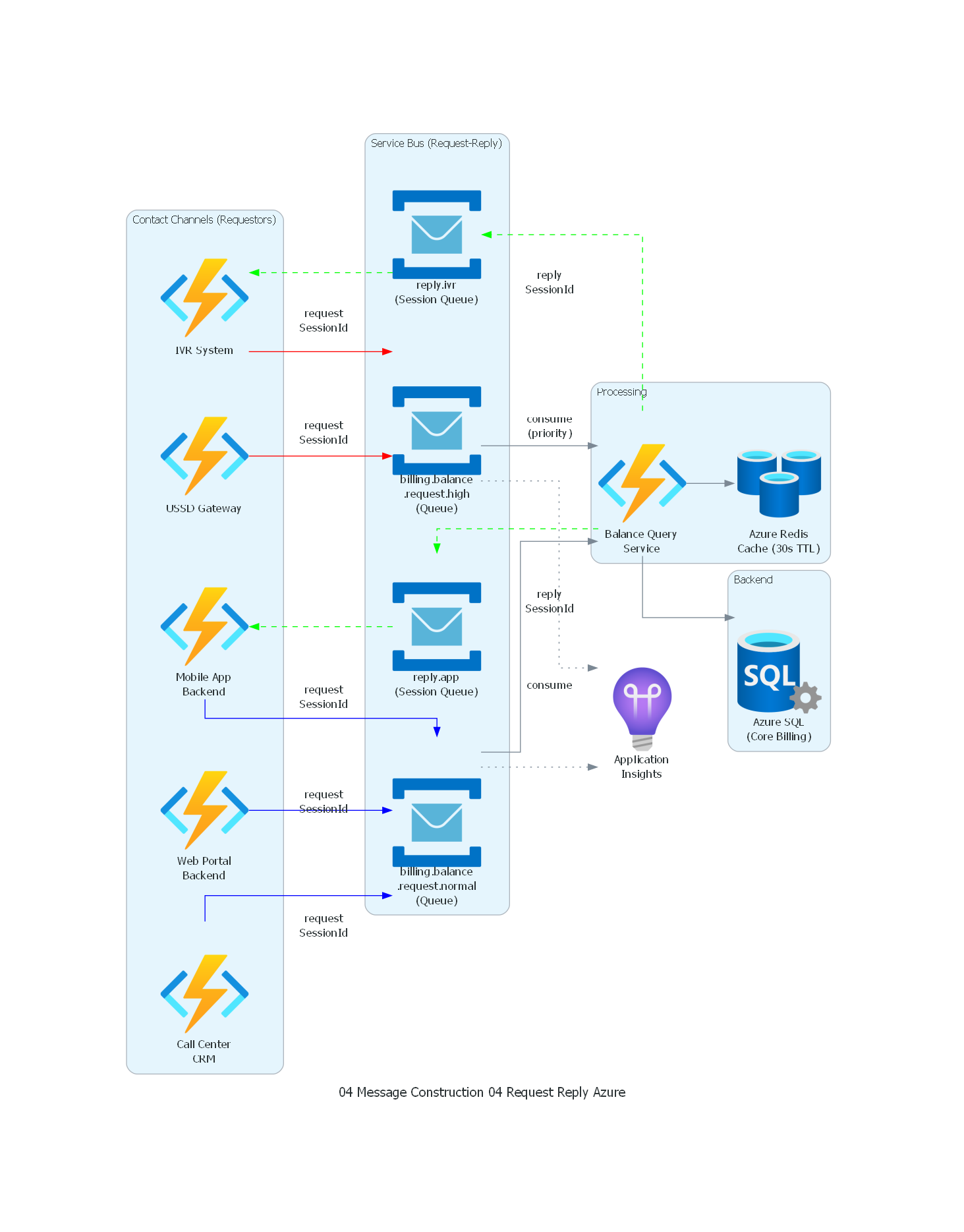 Azure Service Bus soporta Request-Reply con sessions: el requestor usa ReplyToSessionId para que sus respuestas se agrupen en una session específica, permitiendo correlación eficiente sin escanear todos los mensajes de la cola de reply.
