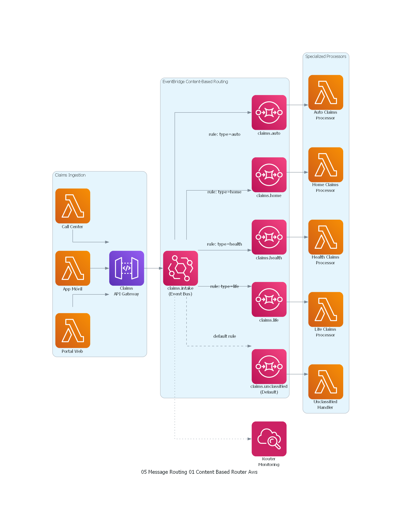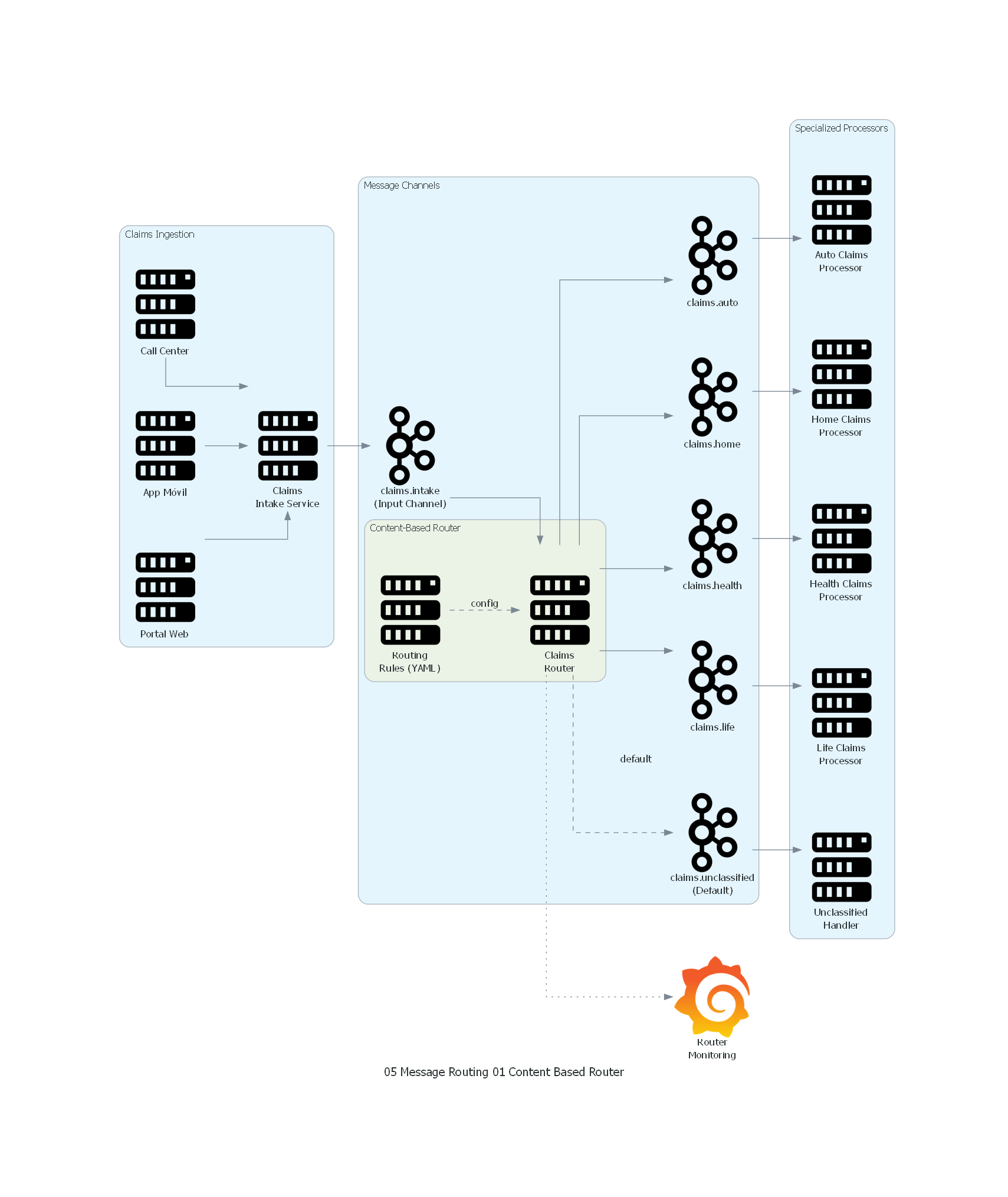- Seguros: una aseguradora recibe reclamaciones de múltiples tipos (auto, hogar, salud, vida). Cada tipo tiene un flujo de procesamiento completamente diferente con reglas de validación, tasación y aprobación distintas. Un Content-Based Router examina el campo