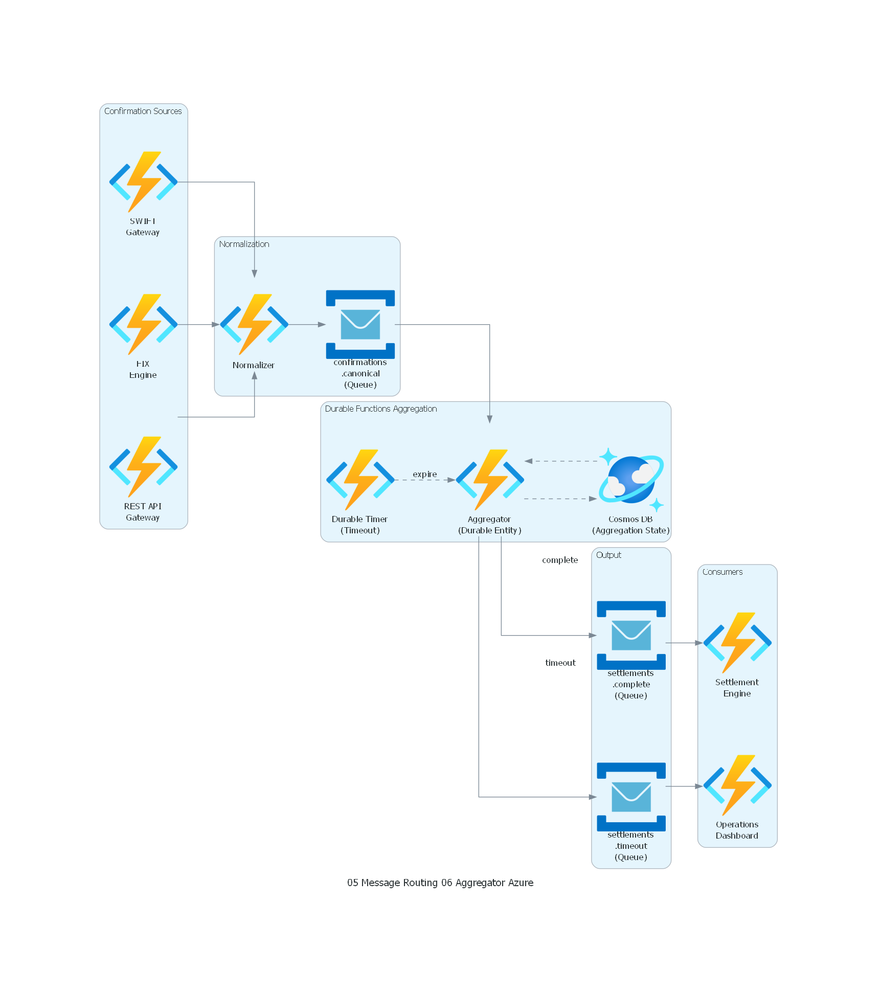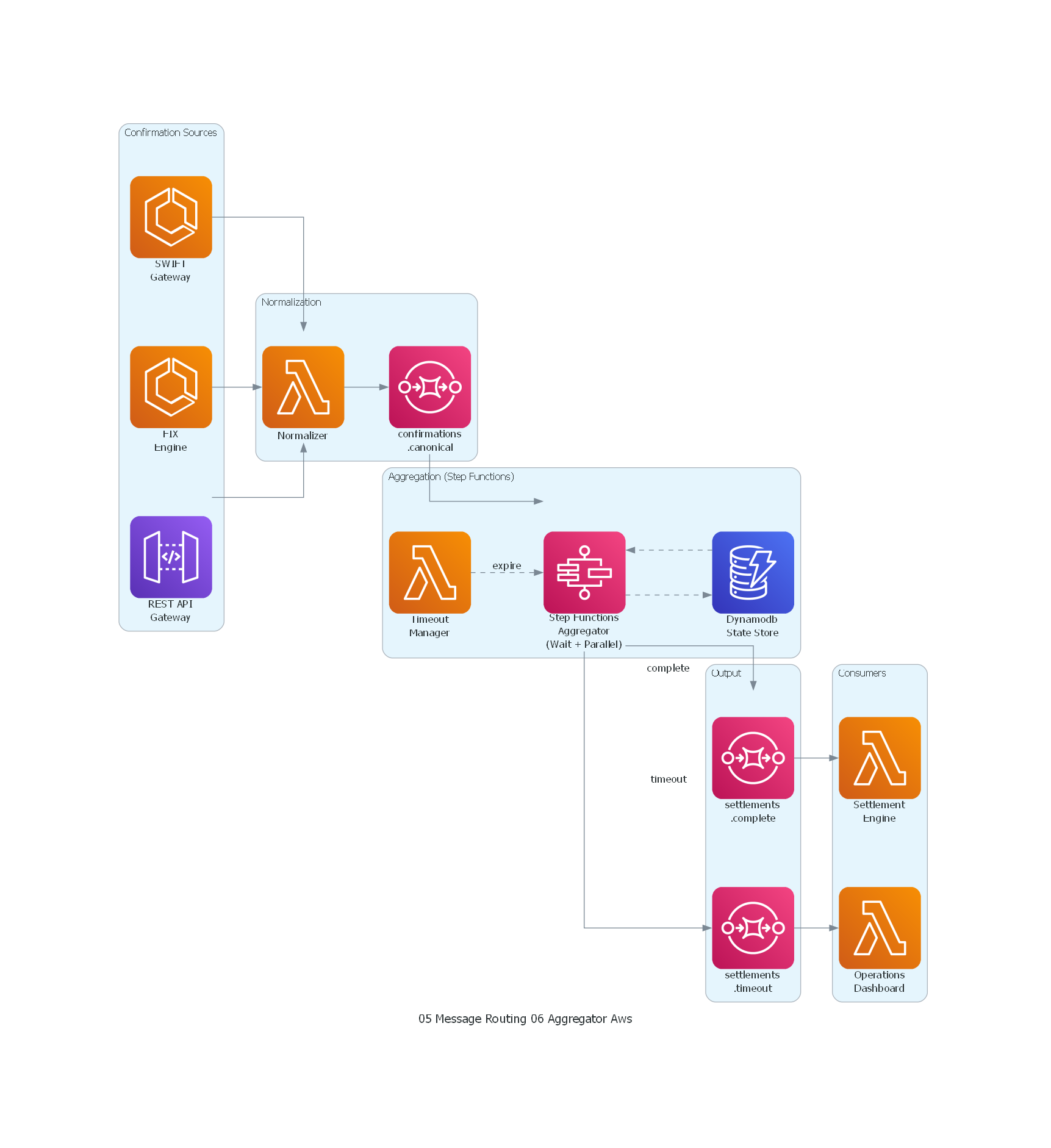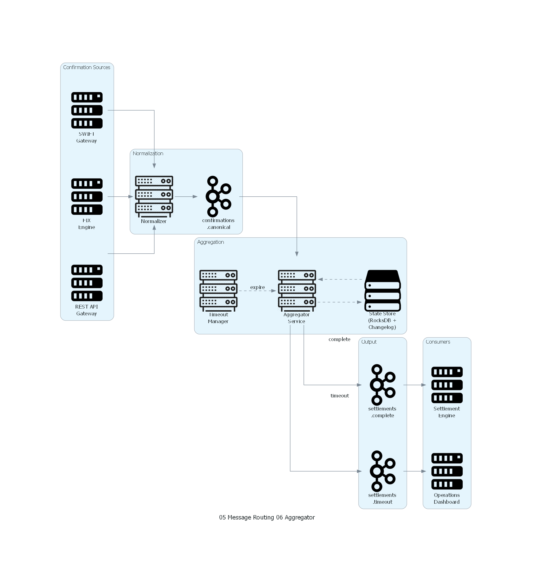 - Banca: en un proceso de liquidación, múltiples contrapartes envían confirmaciones parciales de una operación. El Aggregator acumula las confirmaciones y, cuando todas las contrapartes han confirmado, emite un mensaje de liquidación completa que inicia la transferencia de fondos.