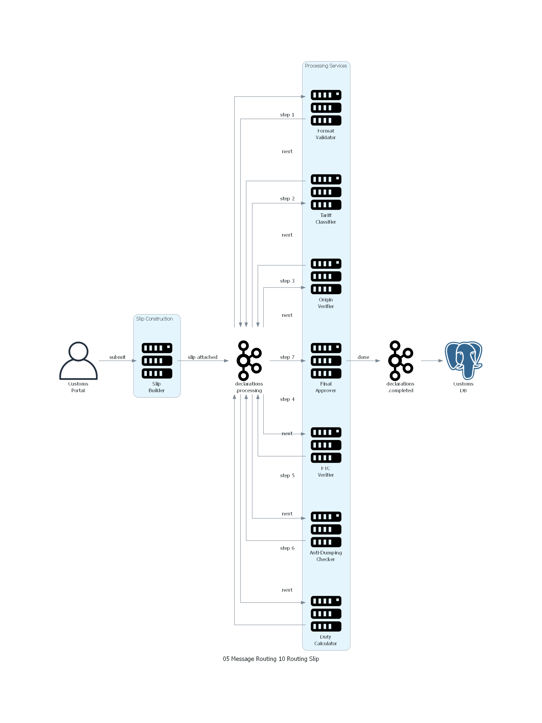 - Processing Component: un componente que sabe cómo leer el routing slip, ejecutar su procesamiento, actualizar el slip (eliminar su paso) y enviar el mensaje al siguiente componente.