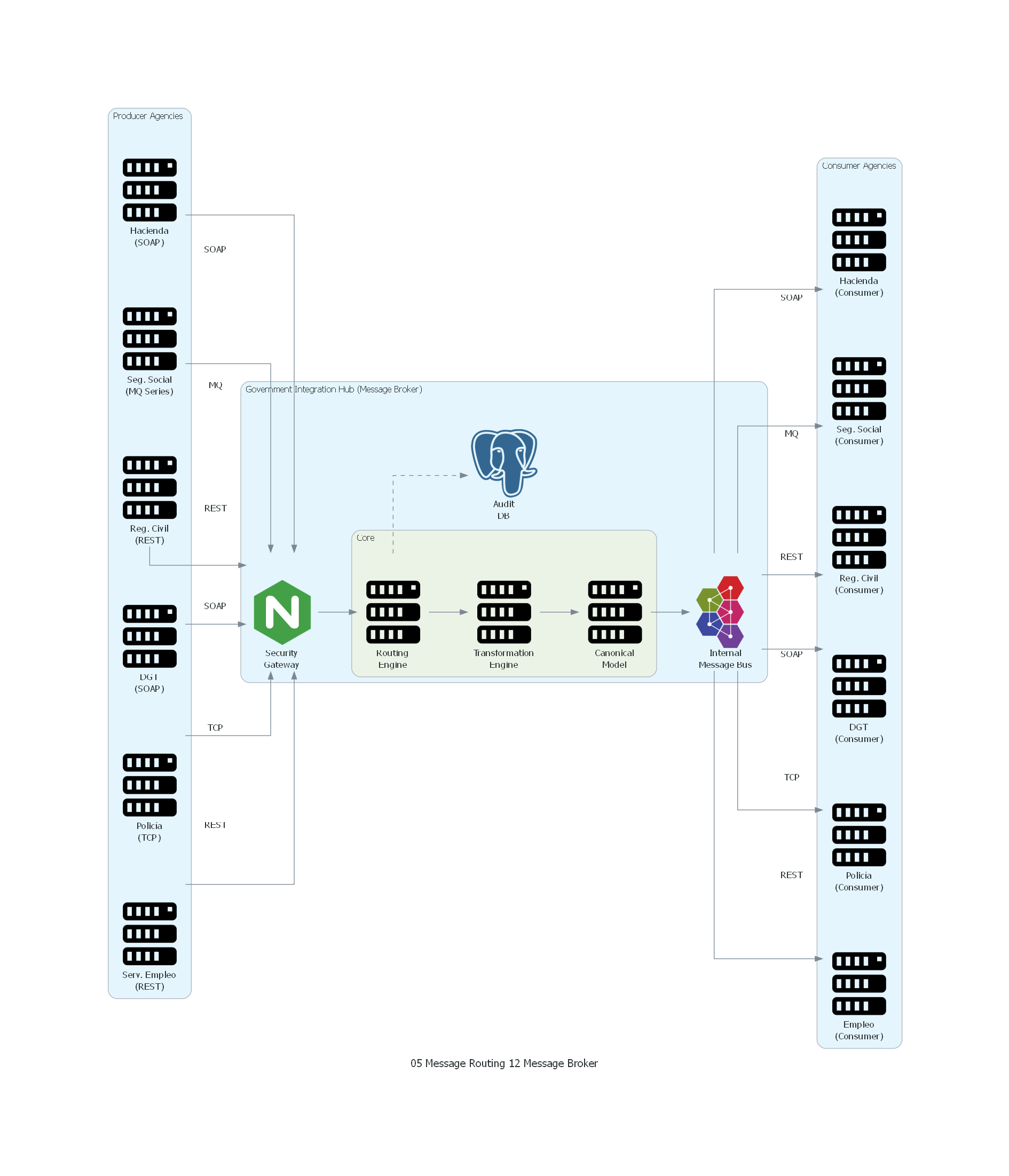 Message Broker es un patrón de enrutamiento que introduce un hub centralizado entre productores y consumidores de mensajes. Este hub asume la responsabilidad de recibir mensajes de los productores, determinar los destinatarios correctos, y entregar los mensajes a esos destinatarios. Los productores no conocen a los consumidores y los consumidores no conocen a los productores — ambos solo conocen al broker.
