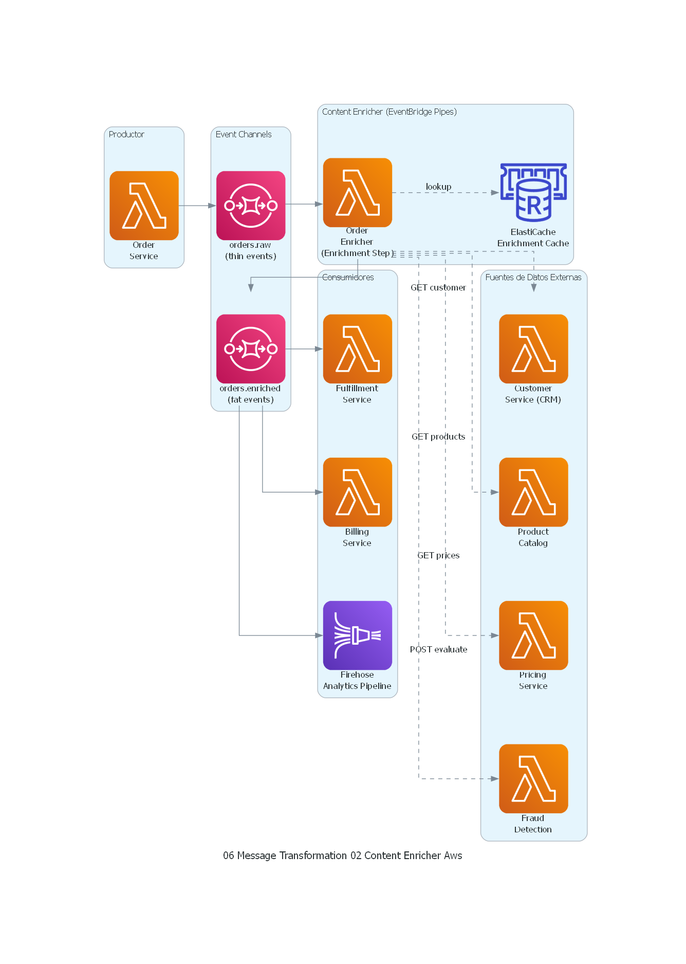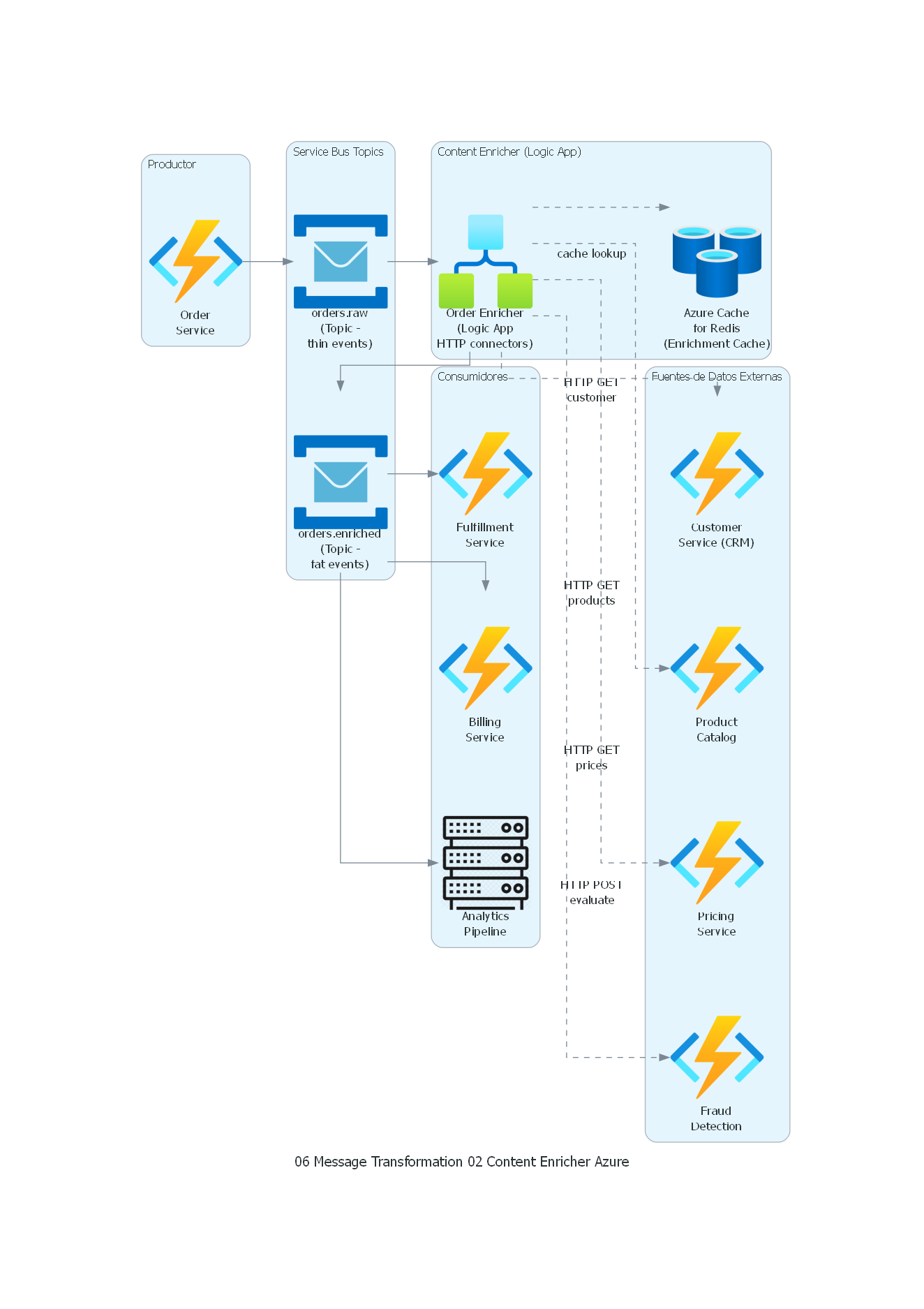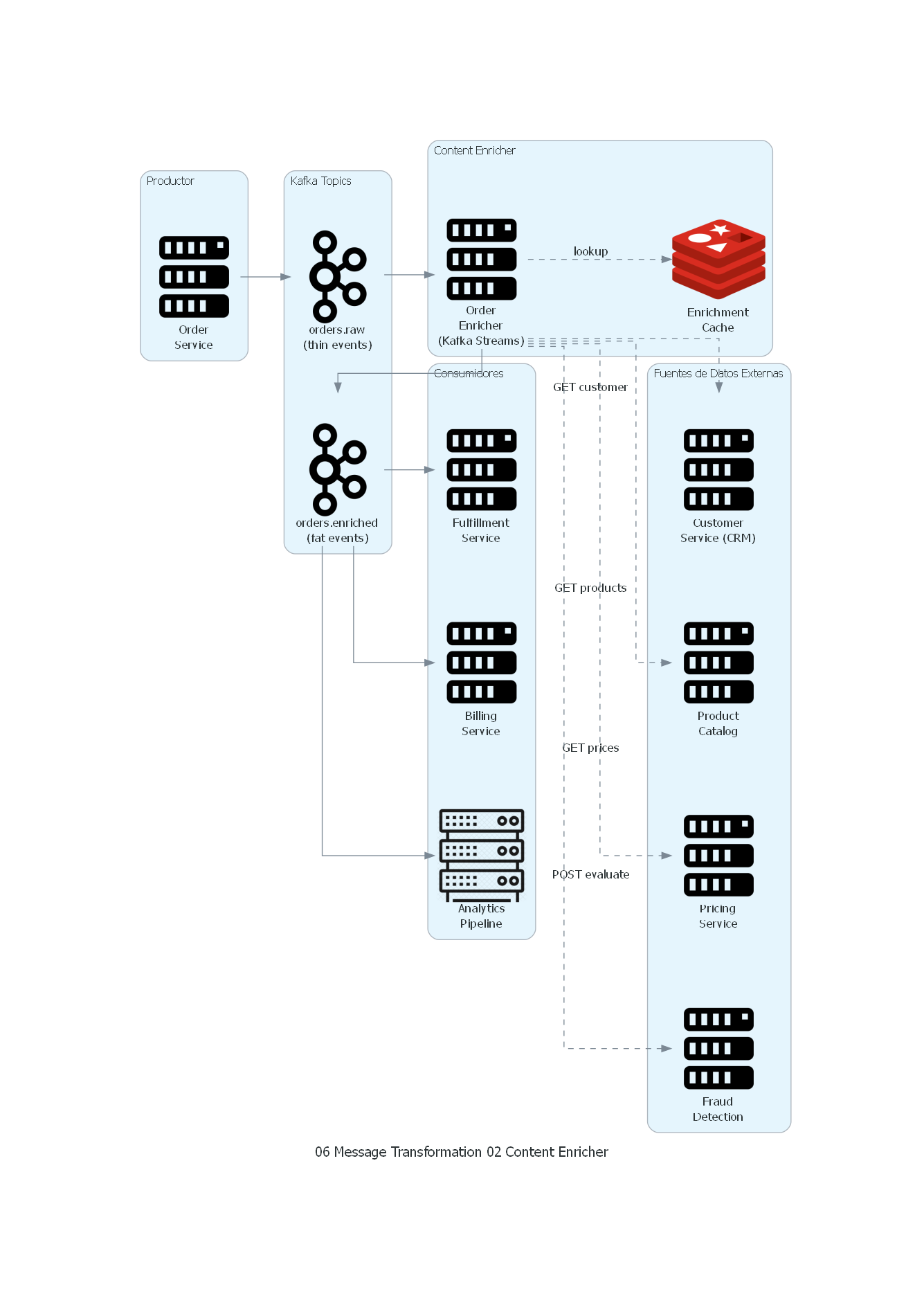 - Volumen: si cada mensaje requiere N consultas a fuentes externas, y hay M mensajes por segundo, el enricher genera N×M requests por segundo a las fuentes — potencial cuello de botella.