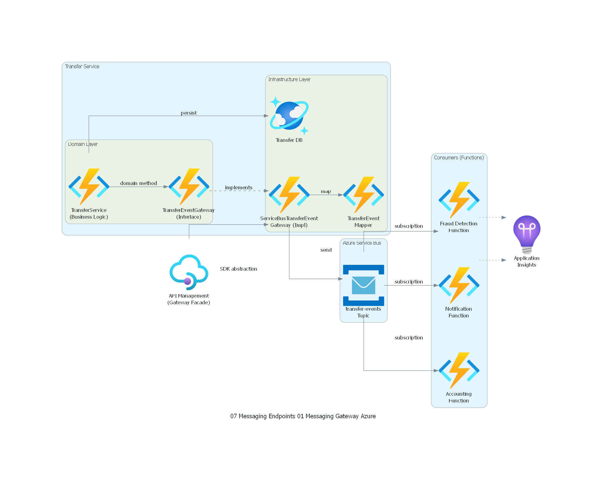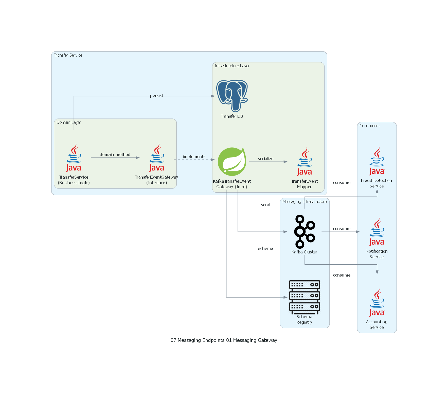 TransferEventGatewayque exponepublishTransferInitiated(Transfer),publishTransferCompleted(Transfer),publishTransferFailed(Transfer, FailureReason). Internamente serializa a Avro, envía al topic correcto con la partition key del account ID, y añade headers de tracing. - E-commerce: un gateway