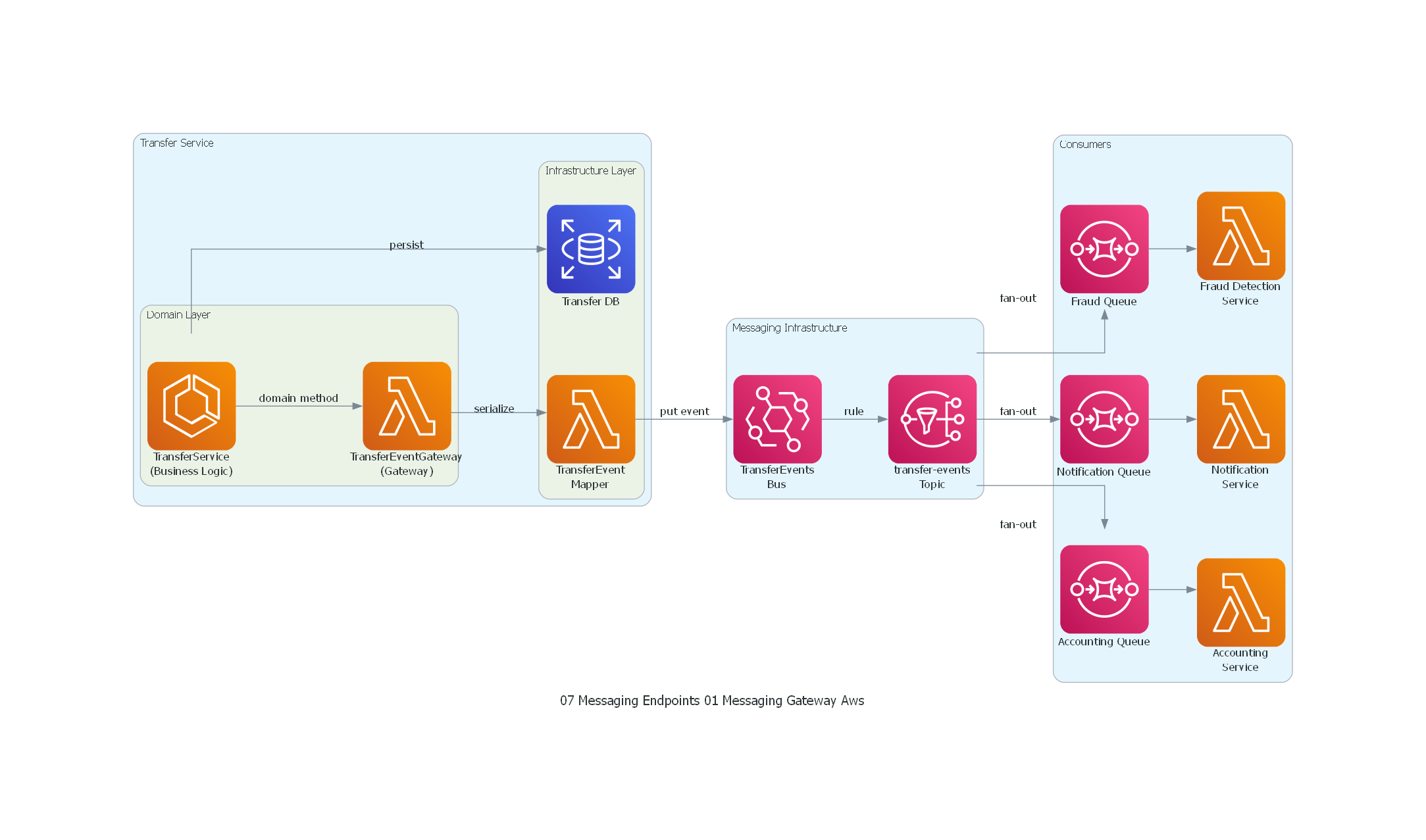 Sin Messaging Gateway, el código de negocio interactúa directamente con la API del broker. Un servicio de transferencias bancarias que necesita publicar un evento después de completar una transferencia podría verse así: