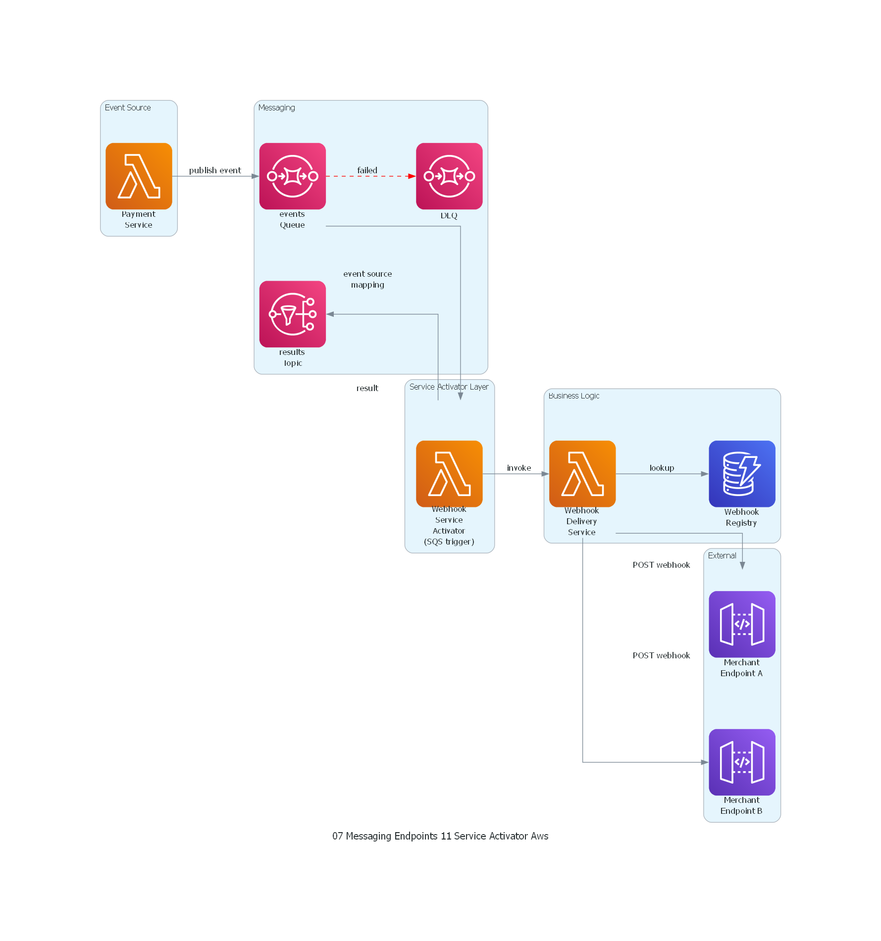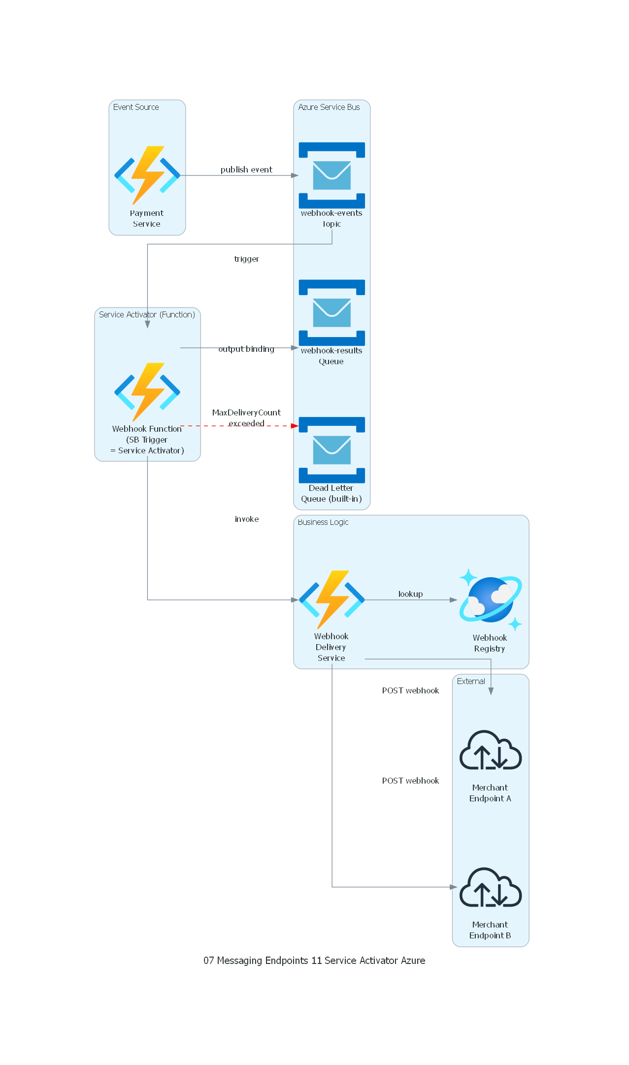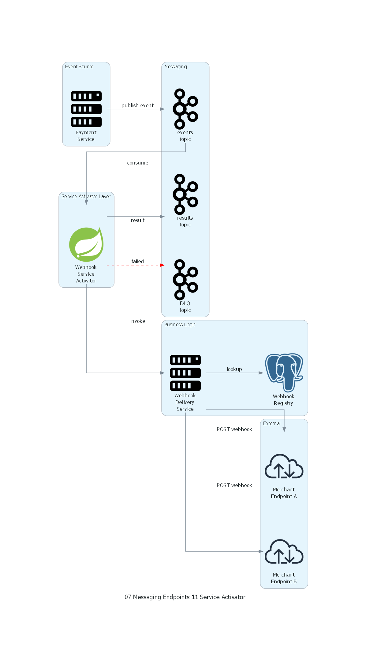 - SaaS Webhook Delivery: una plataforma SaaS (como Stripe o Twilio) publica eventos en un topic interno. Un Service Activator consume cada evento, invoca el servicio de delivery que realiza el HTTP POST al webhook URL del cliente, y produce un mensaje de resultado (éxito/fallo/retry) al canal de tracking.
