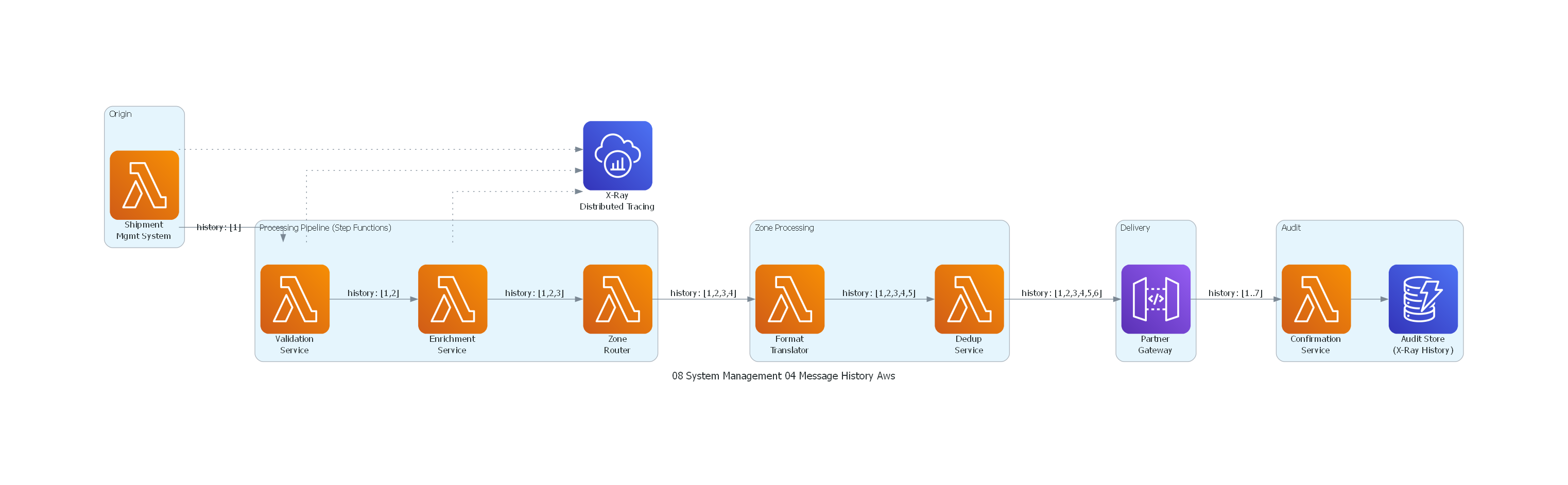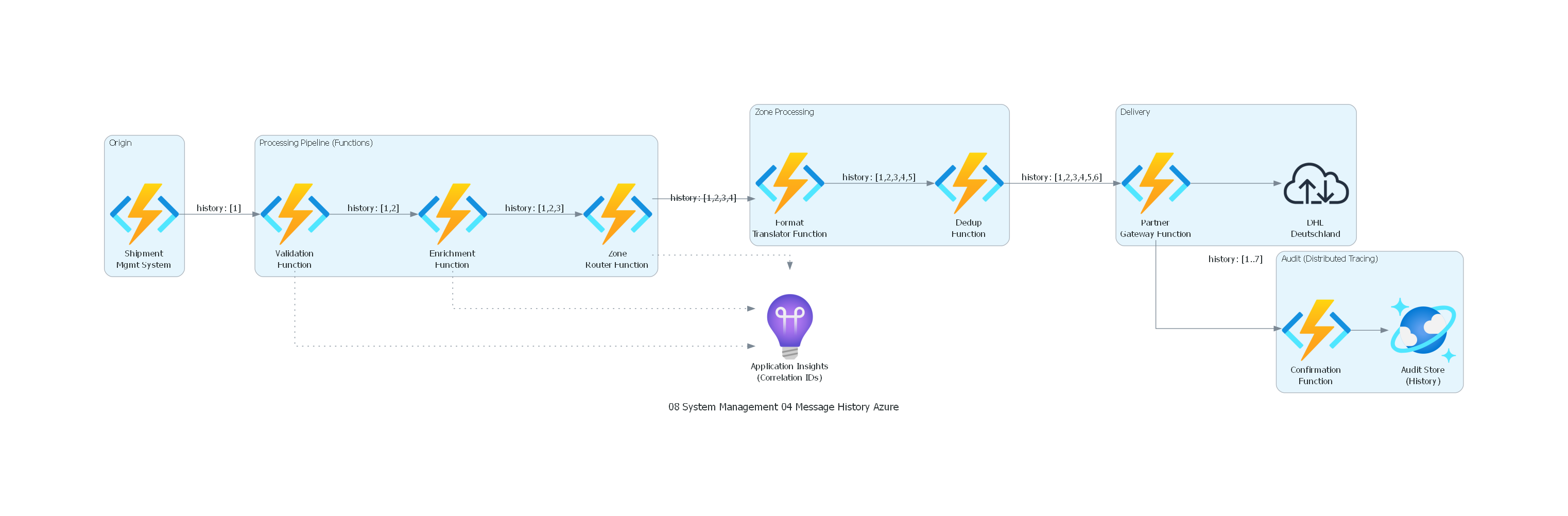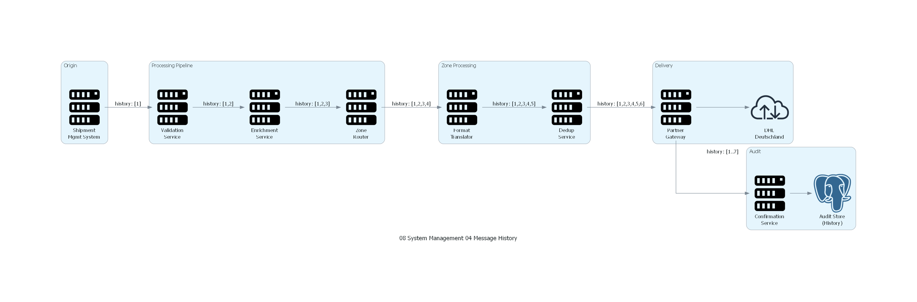 En sistemas distribuidos, la correlación de eventos a través de múltiples servicios es un problema bien conocido. Message History resuelve este problema para mensajes de integración proporcionando una estructura de datos estándar (la lista de entradas de historial) que cada componente extiende, creando una cadena verificable de procesamiento.